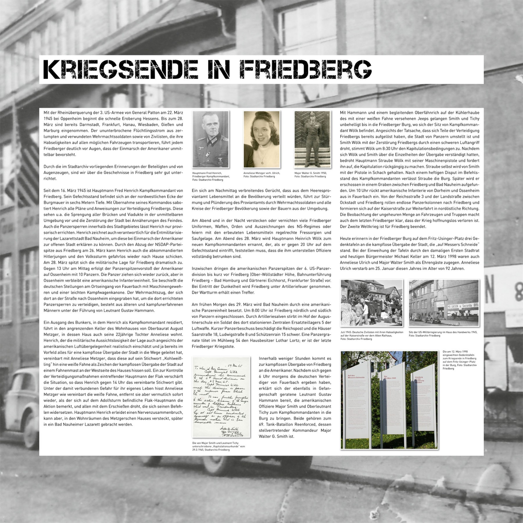 Texttafel "KRIEGSENDE IN FRIEDBERG" zu der Ereignissen im März 1945 und der kampflosen Übergabe der Stadt am 29. März 1945.