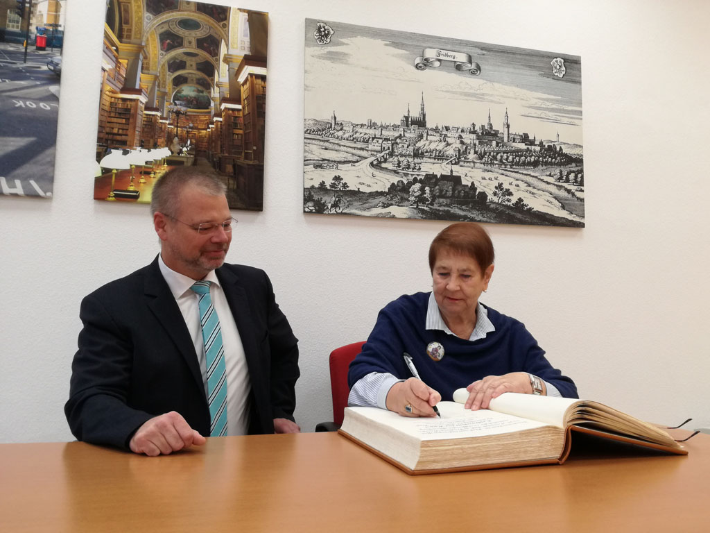 Dr. Ina-Maria Reuß mit Bürgermeister Dirk Antkowiak beim Eintrag in das Goldene Buch der Stadt Friedberg (Hessen)
