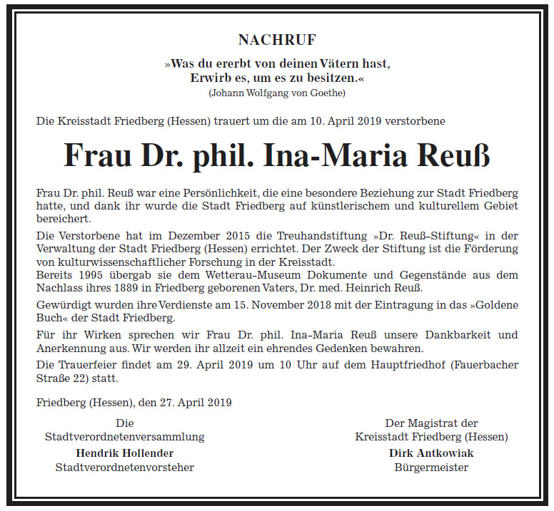 Nachruf Dr. Ina-Maria Reuß